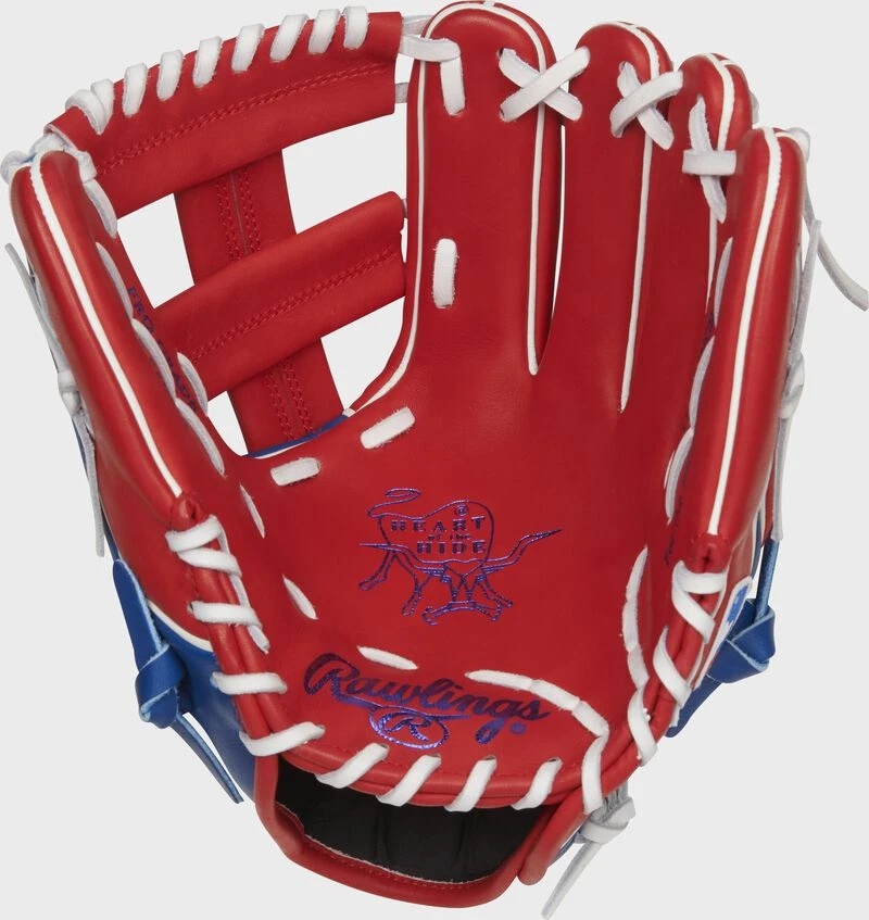 This unique HOH infield glove features a scarlet/royal team-color design and the Rangers logo embroidered on the thumb. As a result, this glove makes the perfect gamer, or a great collector’s item for any Rangers fan too! The 11.5-inch glove was constructed in our 200 pattern, popular for it’s deep, round pocket promoting lightning fast ball transfers and great versatility across the infield. It also has our popular Wing Tip back and single post web that perfectly accents the Rangers logo.